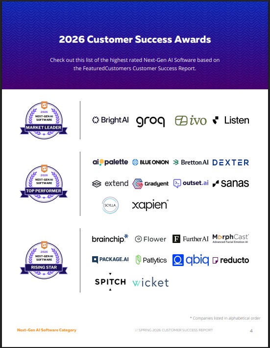 COOPER CITY, FL, UNITED STATES, April 28, 2026 /EINPresswire.com/ — Today FeaturedCustomers published the Spring 2026 Next-Gen AI Software Customer Success Report to give prospects better insight on which Next-Gen AI Software would work best for their business according to real customer references.